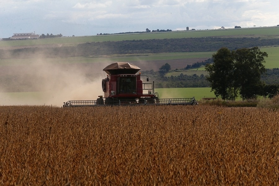 4月12日,在巴西戈亞斯州班德里尼亞農(nóng)場(chǎng),農(nóng)機(jī)進(jìn)行收獲大豆作業(yè)。新華社發(fā)(盧西奧·塔沃拉攝)