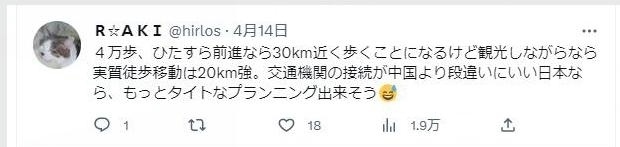 “4萬步,直線距離相當(dāng)于將近30公里,不過如果是徒步邊走邊逛景點(diǎn),差不多是20來公里。如果在公共交通更便利的日本,應(yīng)該能壓縮出一個更緊湊的行程。”