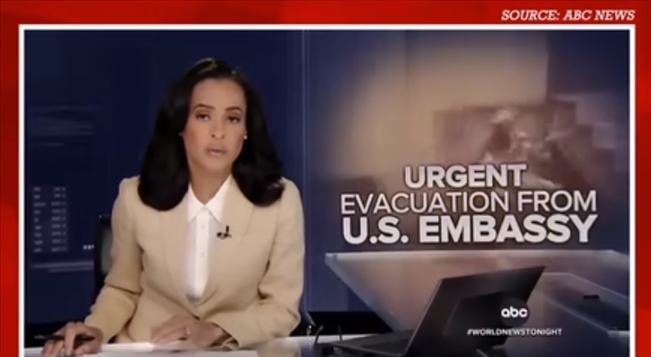 (安柏然所發(fā)視頻中,一名美媒主持人報(bào)道美國(guó)在夜間出動(dòng)直升機(jī)撤離美國(guó)外交官的畫(huà)面。)