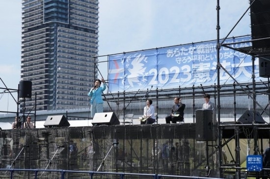 5月3日,在日本東京有明防災(zāi)公園的廣場上,在野黨社民黨黨首福島瑞穗在集會上發(fā)表演講。新華社記者 張笑宇 攝