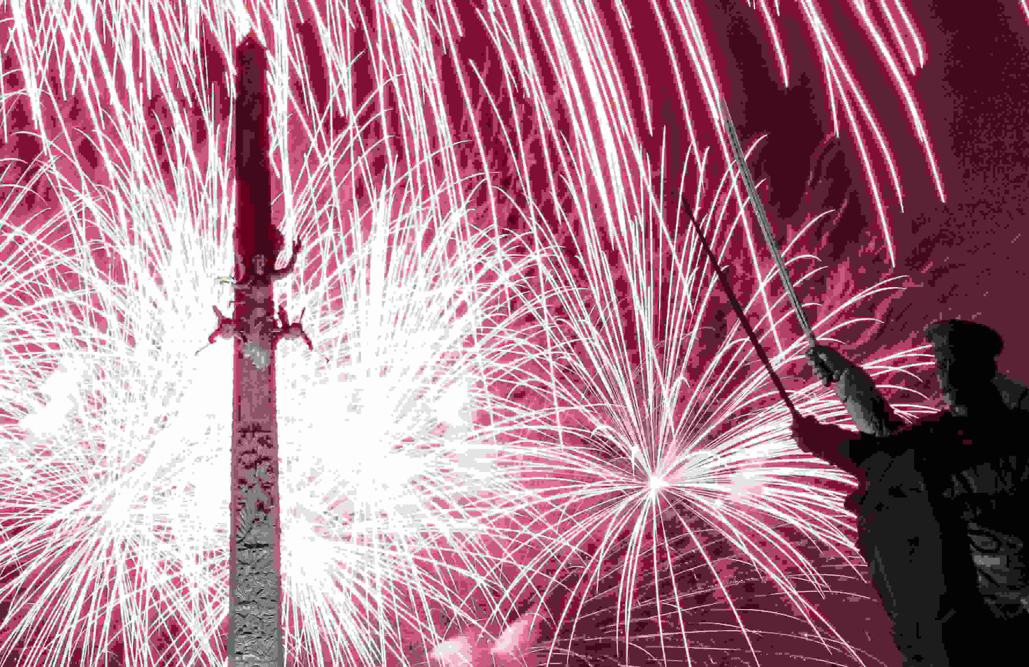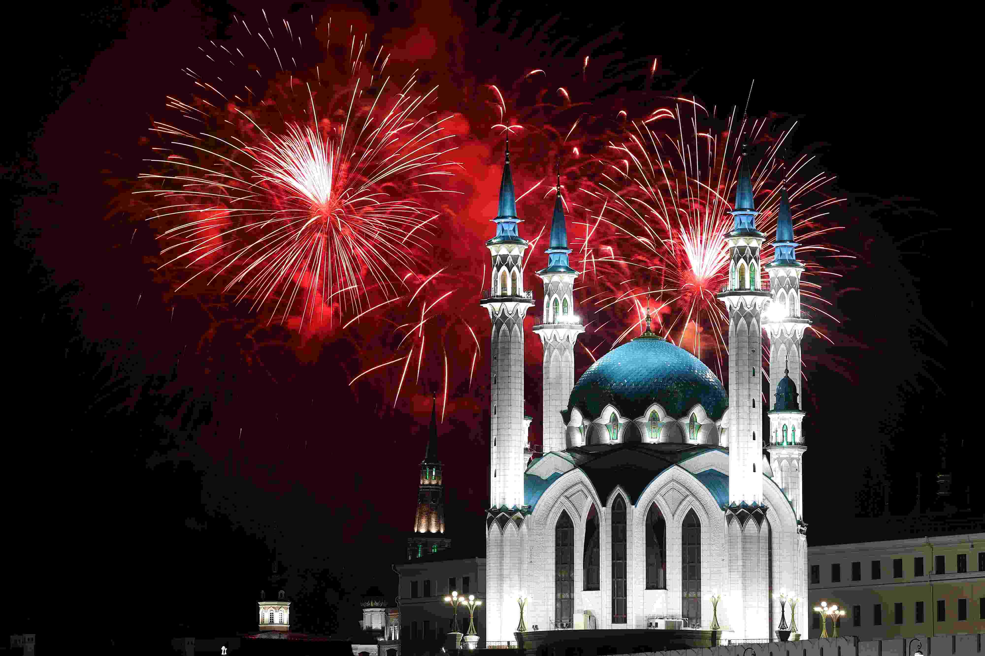 當(dāng)?shù)貢r(shí)間2023年5月9日,俄羅斯喀山,紀(jì)念衛(wèi)國(guó)戰(zhàn)爭(zhēng)勝利78周年,庫(kù)爾沙里夫清真寺燃放煙花。視覺(jué)中國(guó)