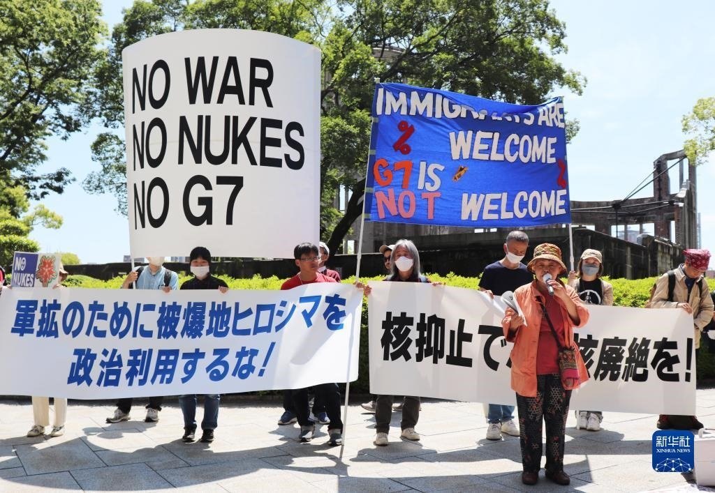 5月14日,在日本廣島和平紀(jì)念公園原子彈轟炸遺址前,日本民眾舉著“不要戰(zhàn)爭、不要核武器、不要G7”等標(biāo)語,強(qiáng)烈抗議七國集團(tuán)(G7)峰會將在廣島召開。新華社記者 楊光 攝