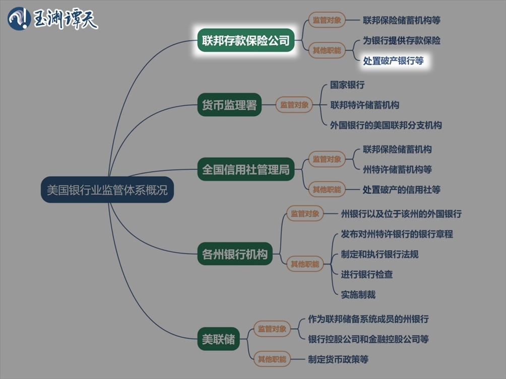 上圖是美國(guó)聯(lián)邦銀行業(yè)監(jiān)管體系的主要部門,可以看到,這個(gè)監(jiān)管體系覆蓋美國(guó)銀行業(yè)的上中下游,而FDIC職責(zé)之一是處置美國(guó)破產(chǎn)銀行。