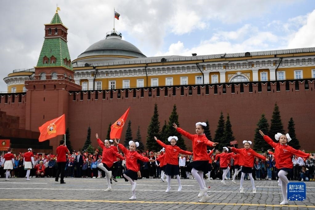 5月21日,在俄羅斯首都莫斯科,孩子們?cè)谏傧汝?duì)入隊(duì)儀式上表演。