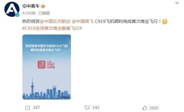 @空中客車:熱烈祝賀@中國東方航空 @中國商飛 C919飛機(jī)順利完成首次商業(yè)飛行!