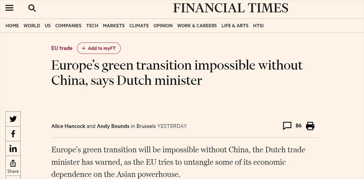 英國《金融時報》28日報道稱,荷蘭外貿與發(fā)展合作大臣施賴納馬赫爾警告稱,沒有中國,歐洲的綠色轉型將無法實現。