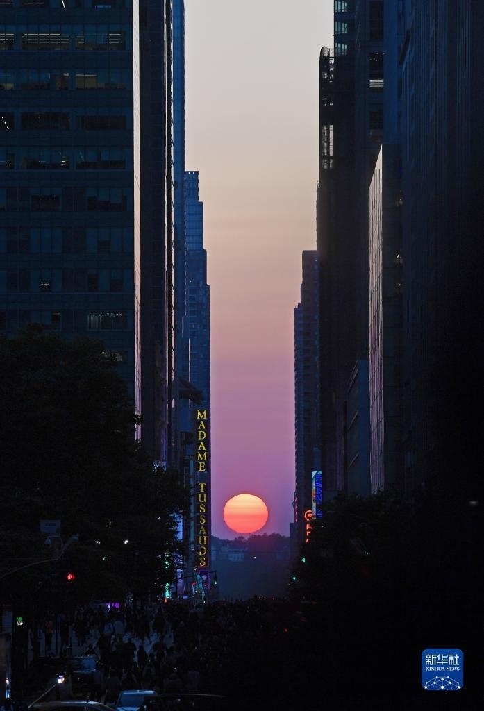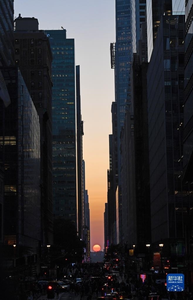 當(dāng)日,紐約出現(xiàn)“曼哈頓懸日”景觀?!奥D懸日”是紐約市標(biāo)志性景觀,每年5月和7月出現(xiàn)兩次,指日落時(shí)太陽正好出現(xiàn)在曼哈頓東西向街道正上方、似乎懸在兩側(cè)高樓大廈之間的戲劇性畫面。新華社記者 李睿 攝