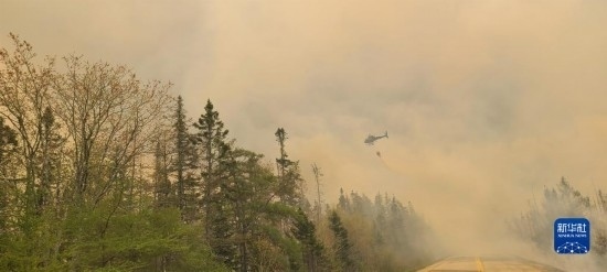 5月31日,在加拿大新斯科舍省謝爾本縣巴靈頓湖附近,一架飛機飛過野火上空。新華社發(fā)(新斯科舍省政府供圖)