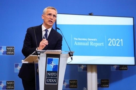2022年3月31日,在比利時(shí)布魯塞爾,北約秘書長(zhǎng)斯托爾滕貝格在新聞發(fā)布會(huì)上講話。新華社記者鄭煥松攝