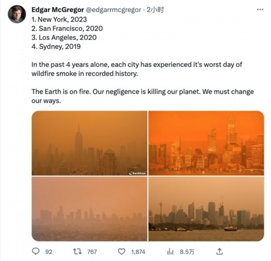 6月7日,紐約市深陷加拿大山火導(dǎo)致的煙霾之時,有網(wǎng)友在社交媒體上列出2019年悉尼、2020年洛杉磯和舊金山、2023年紐約的類似污染畫面,并留言道:“地球在著火”“我們必須作出改變”。