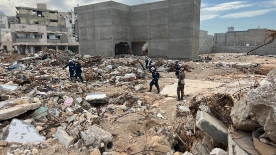 9月17日,國(guó)際救援人員在利比亞德爾納的建筑廢墟上工作。新華社發(fā)(哈姆扎·圖爾基亞攝)