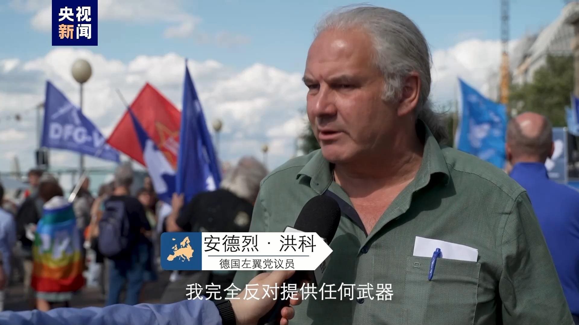 德國民眾 沃爾夫?qū)?/strong>:我們在這里(柏林)要求立即實(shí)現(xiàn)?;?。作為和平主義者我們反對北約,反對軍事手段。軍事手段不是俄烏沖突的解決方案。俄烏沖突只能通過外交手段解決。