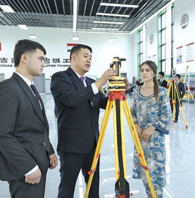 4月12日,在塔吉克斯坦首都杜尚別的魯班工坊內(nèi),來(lái)自天津城市建設(shè)管理職業(yè)技術(shù)學(xué)院的老師吳正鵬(左二)向?qū)W生講解測(cè)繪儀器使用方法。奧斯帕諾夫攝(新華社發(fā))