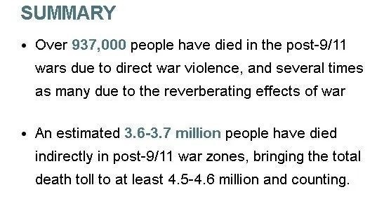 耿直哥查詢公開資料發(fā)現(xiàn),這個(gè)450萬的死亡數(shù)字出自布朗大學(xué)沃森國際與公共事務(wù)學(xué)院一項(xiàng)名為“戰(zhàn)爭的代價(jià)”的研究項(xiàng)目。該項(xiàng)目對(duì)過去22年遭美國戰(zhàn)爭荼毒的阿富汗、伊拉克、利比亞、索馬里、敘利亞,以及巴基斯坦的部分地區(qū)進(jìn)行了調(diào)查,認(rèn)為美國的戰(zhàn)爭直接導(dǎo)致93.7萬人死亡,還有大約360-370萬人間接死亡。