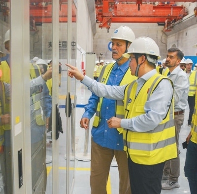 巴基斯坦卡洛特水電站是中巴經(jīng)濟(jì)走廊首個(gè)水電投資項(xiàng)目,由中國(guó)三峽集團(tuán)投資開(kāi)發(fā)建設(shè),運(yùn)營(yíng)一年來(lái)節(jié)約標(biāo)準(zhǔn)煤約140萬(wàn)噸,減少二氧化碳排放約350萬(wàn)噸。圖為中方技術(shù)人員向來(lái)訪的巴基斯坦代表團(tuán)介紹水電站運(yùn)行情況。本報(bào)巴基斯坦分社 薩義德·邁赫迪攝