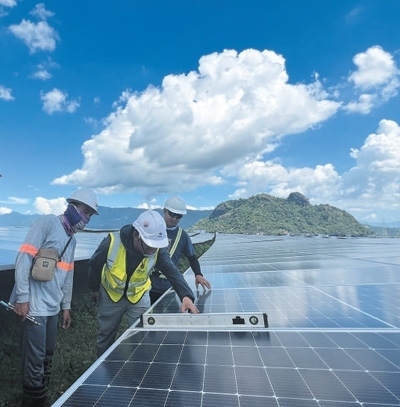 菲律賓圣馬塞利諾光伏項(xiàng)目由中國(guó)電力建設(shè)集團(tuán)有限公司承建,項(xiàng)目建成后將成為該國(guó)最大的光伏電站,每年將為菲律賓供電5.9億千瓦時(shí)。圖為中方工程師(中)帶領(lǐng)菲方工作人員檢查調(diào)試光伏支架。楊獲然攝