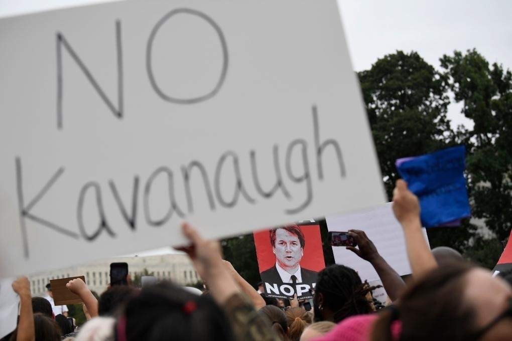 2018年10月6日,在美國(guó)首都華盛頓聯(lián)邦最高法院前,抗議者反對(duì)卡瓦諾出任聯(lián)邦最高法院大法官。新華社記者劉杰攝