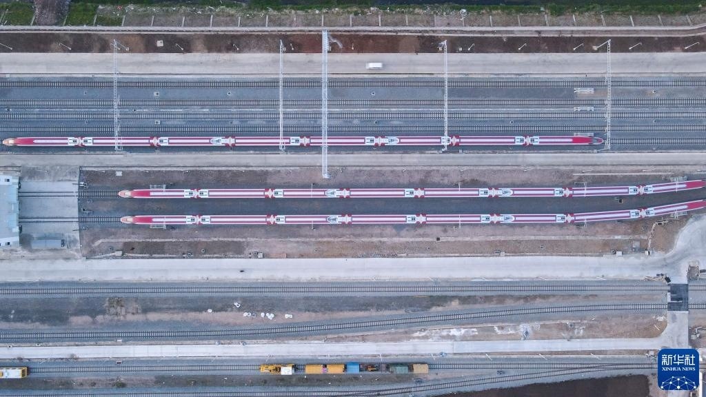 7月20日,雅萬高鐵列車停靠在印度尼西亞萬隆德卡魯爾動車所附近(無人機(jī)照片)。新華社記者 徐欽 攝