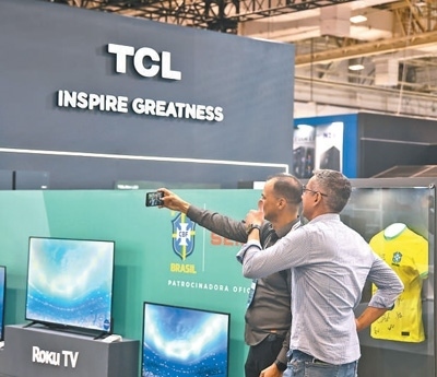 在2023年圣保羅國際消費(fèi)類電子及家用電器產(chǎn)品展覽會上,參觀者在TCL展臺前合影留念。本報記者 時元皓攝