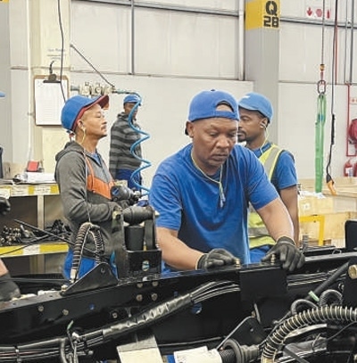 中國第一汽車集團有限公司南非庫哈工廠生產(chǎn)線上,當(dāng)?shù)貑T工在組裝車輛。本報記者 鄒 松攝