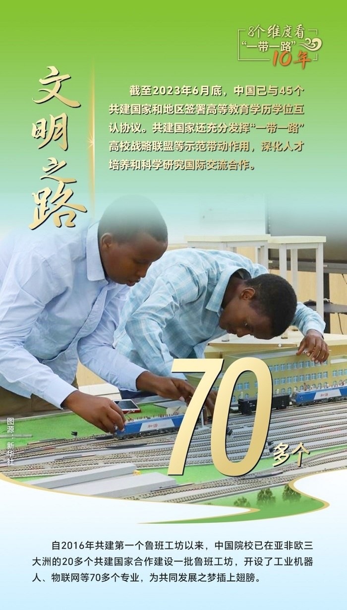 10年來(lái),創(chuàng)新始終是一個(gè)關(guān)鍵詞,中國(guó)與共建國(guó)家加強(qiáng)科技創(chuàng)新合作,加速集聚創(chuàng)新資源,為共建“一帶一路”注入強(qiáng)勁動(dòng)力。截至2023年6月底,中國(guó)與80多個(gè)共建國(guó)家簽署《政府間科技合作協(xié)定》,“一帶一路”國(guó)際科學(xué)組織聯(lián)盟(ANSO)成員單位達(dá)58家;2013年以來(lái),中國(guó)支持逾萬(wàn)名共建國(guó)家青年科學(xué)家來(lái)華開(kāi)展短期科研工作和交流,累計(jì)培訓(xùn)共建國(guó)家技術(shù)和管理人員1.6萬(wàn)余人次;累計(jì)幫助50多個(gè)非洲國(guó)家建成20多個(gè)農(nóng)業(yè)技術(shù)示范中心,在農(nóng)業(yè)、新能源、衛(wèi)生健康等領(lǐng)域啟動(dòng)建設(shè)50余家“一帶一路”聯(lián)合實(shí)驗(yàn)室。
