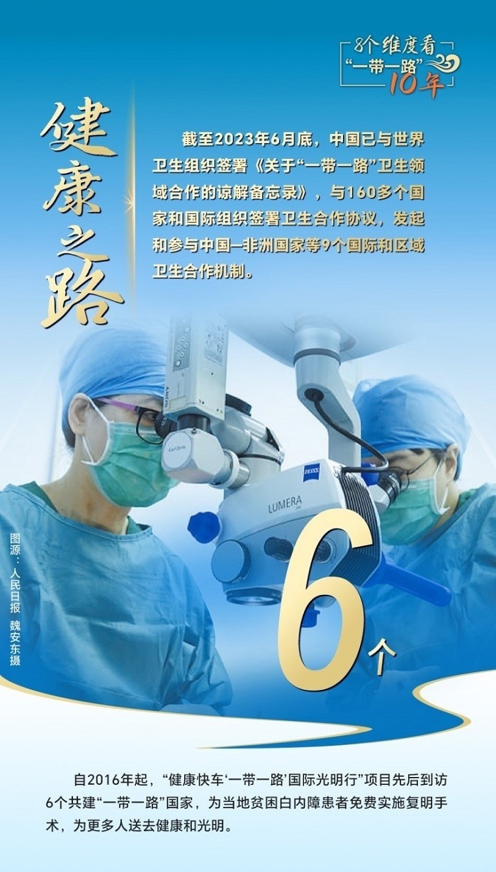 截至2023年6月底,中國(guó)已與世界衛(wèi)生組織簽署《關(guān)于“一帶一路”衛(wèi)生領(lǐng)域合作的諒解備忘錄》,與160多個(gè)國(guó)家和國(guó)際組織簽署衛(wèi)生合作協(xié)議,發(fā)起和參與中國(guó)—非洲國(guó)家、中國(guó)—阿拉伯國(guó)家、中國(guó)—東盟衛(wèi)生合作等9個(gè)國(guó)際和區(qū)域衛(wèi)生合作機(jī)制。為共建國(guó)家培養(yǎng)數(shù)萬(wàn)名衛(wèi)生管理、公共衛(wèi)生、醫(yī)學(xué)科研等專(zhuān)業(yè)人才,向58個(gè)國(guó)家派出中國(guó)醫(yī)療隊(duì),赴30多個(gè)國(guó)家開(kāi)展“光明行”,免費(fèi)治療白內(nèi)障患者近萬(wàn)名,與湄公河流域國(guó)家、中亞國(guó)家、蒙古國(guó)等周邊國(guó)家開(kāi)展跨境醫(yī)療合作,衛(wèi)生健康合作成效顯著。