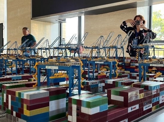 考察團(tuán)成員拍照記錄青島港全自動化碼頭布局