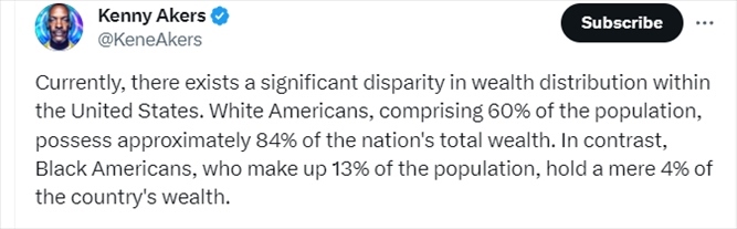 美國網(wǎng)友發(fā)文批評美國財富不平等現(xiàn)象表示,占據(jù)美國總人口60%的白人擁有全美大約84%的財富,而占據(jù)人口13%的美國非裔卻只擁有4%。