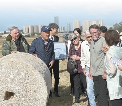 在云南昆明呈貢機(jī)場舊址,代表團(tuán)一行聆聽講解員講述石碾背后的故事。呈貢機(jī)場曾是飛虎隊(duì)在昆明的主要基地之一,機(jī)場建設(shè)期間,當(dāng)?shù)厝嗣窭瓌泳薮笫肫秸艿?,付出艱苦努力。本報(bào)記者 劉玲玲攝
