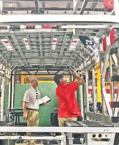 在位于美國加州蘭卡斯特市的比亞迪大巴工廠里,工作人員正在檢查設(shè)備。郜夢日攝