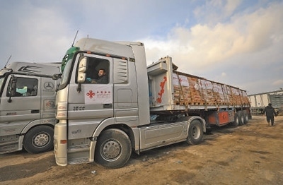 12月17日,載有中國(guó)援助的人道主義物資的貨車(chē)抵達(dá)凱雷姆沙洛姆口岸加沙地帶一側(cè)。亞西爾·庫(kù)迪攝(新華社發(fā))