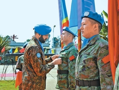 7月25日,剛果(金)南基伍省布卡武市中國(guó)半島營(yíng)區(qū)。在高高飄揚(yáng)的聯(lián)合國(guó)旗幟和中國(guó)、剛果(金)兩國(guó)國(guó)旗下,中國(guó)第二十六批赴剛果(金)維和部隊(duì)全體官兵被授予聯(lián)合國(guó)“和平勛章”。