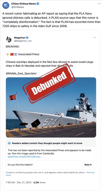 一個(gè)名為“Megatron”的擁有十多萬(wàn)“粉絲”的賬號(hào)在社交平臺(tái)“X”(原推特)上說(shuō):“美聯(lián)社突發(fā)新聞!中國(guó)軍艦在曼德海峽拒絕協(xié)助以色列貨船,且無(wú)視他們的呼救?!辟N文后還配了一張中國(guó)軍艦的照片。