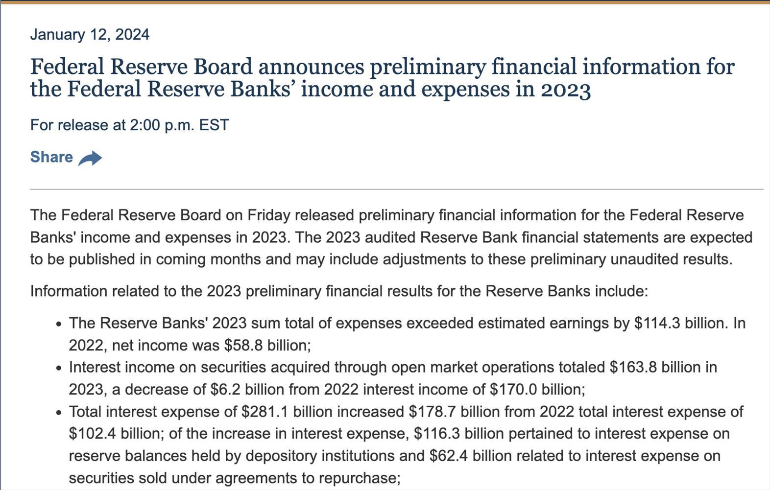 當(dāng)?shù)貢r(shí)間1月12日,美國(guó)聯(lián)邦儲(chǔ)備委員會(huì)(下稱“美聯(lián)儲(chǔ)”)在官網(wǎng)發(fā)文公布了美國(guó)聯(lián)邦儲(chǔ)備銀行2023年收入和支出的初步財(cái)務(wù)信息。