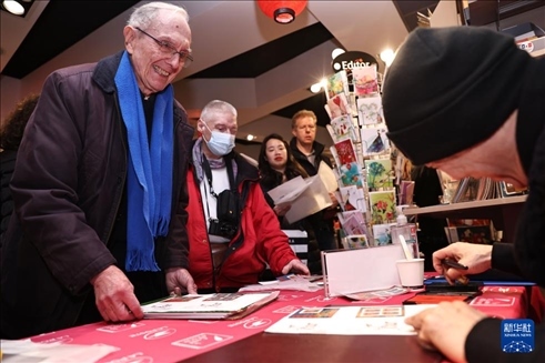 1月26日,在法國巴黎舉行的發(fā)行儀式上,郵票設(shè)計者陳江洪為當(dāng)?shù)丶]愛好者簽字留念。新華社記者 高靜 攝