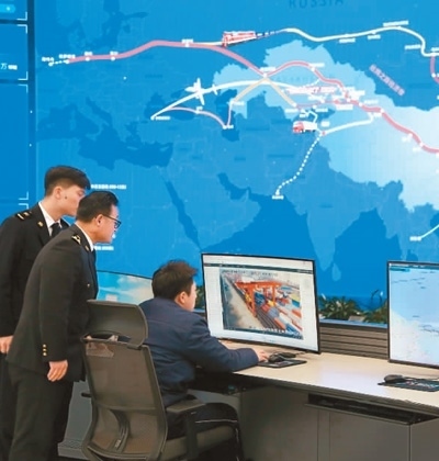 在中哈(連云港)物流合作基地數(shù)字化調(diào)度中心,海關(guān)關(guān)員在對中歐班列動態(tài)、現(xiàn)場裝卸情況等進行實時監(jiān)控。近年來,連云港海關(guān)還創(chuàng)新應(yīng)用中歐班列“保稅+出口”集裝箱混拼、“鐵路快速通關(guān)”等通關(guān)便利化舉措,不斷提升貨物通關(guān)效率。本報記者 石 暢攝