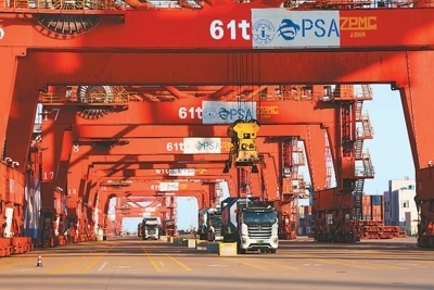 貨輪??窟B云港港口后,集裝箱通過“船車直取”的模式,被直接吊裝上短駁車,分流至中哈(連云港)物流合作基地,貨物集結(jié)后被裝上火車,運往中亞、歐洲等國家和地區(qū)。 本報記者 石 暢攝