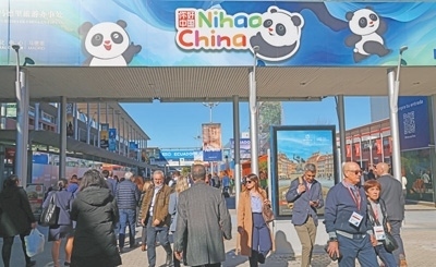 會(huì)展中心外側(cè)主通道的顯著位置,印有“你好!中國”國家旅游形象圖案的廣告牌。 本報(bào)記者 許海林?jǐn)z