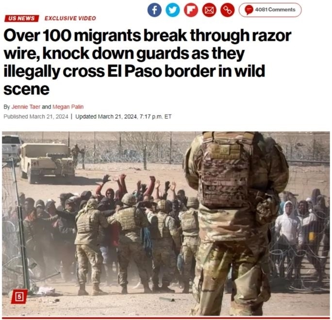 中新網(wǎng)3月22日電 綜合外媒報(bào)道,當(dāng)?shù)貢r(shí)間21日,在得克薩斯州邊境墻附近,有上百名非法移民沖破鐵絲網(wǎng)試圖非法進(jìn)入美國(guó)。他們撞倒得州國(guó)民警衛(wèi)隊(duì)成員,試圖越過美墨邊境,場(chǎng)面一度十分混亂。
