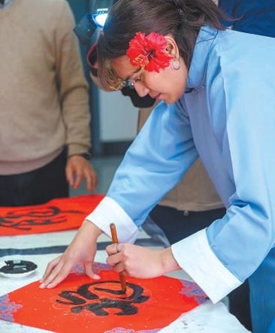 安雅在學校為留學生舉辦的新春活動上用毛筆書寫“?!弊?。受訪者供圖