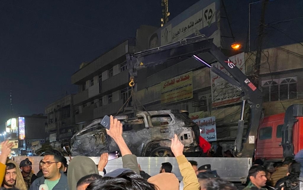 ?2024年2月7日,在伊拉克首都巴格達(dá),民防部門(mén)轉(zhuǎn)移遭無(wú)人機(jī)襲擊的車(chē)輛。新華社發(fā)(哈利勒·達(dá)伍德攝)