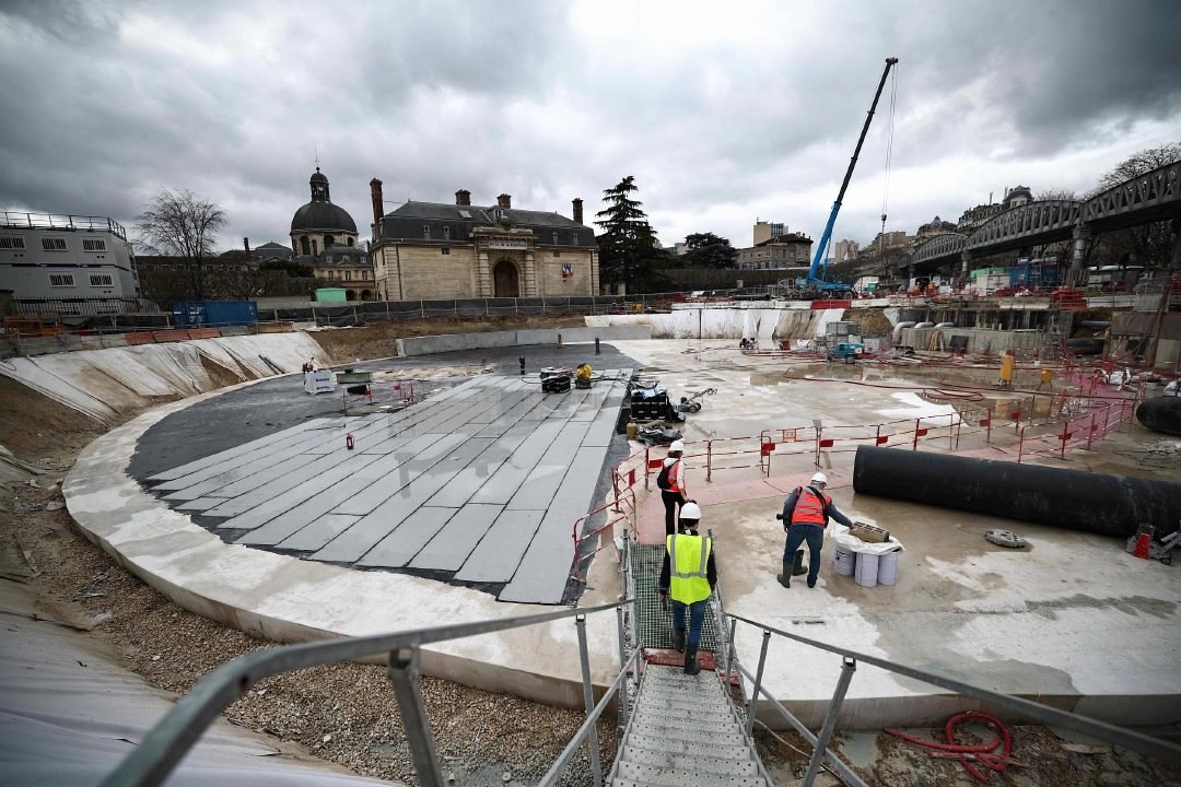 當(dāng)?shù)貢r間2024年3月13日,法國巴黎,建造中的巨型地下雨水蓄水池施工現(xiàn)場。