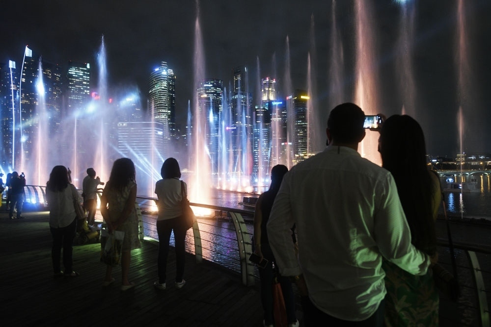 2022年4月28日,游客在新加坡濱海灣金沙觀賞一場燈光噴泉秀。新華社發(fā)(鄧智煒攝)
