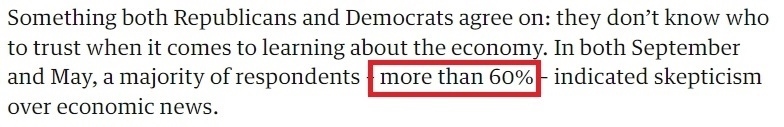 而無(wú)論是共和黨人還是民主黨人,幾乎所有受訪者都同意的一點(diǎn)是:在了解經(jīng)濟(jì)情況方面,他們不知道該相信誰(shuí)。民調(diào)顯示,超六成美國(guó)人對(duì)經(jīng)濟(jì)新聞的真實(shí)性表示質(zhì)疑。