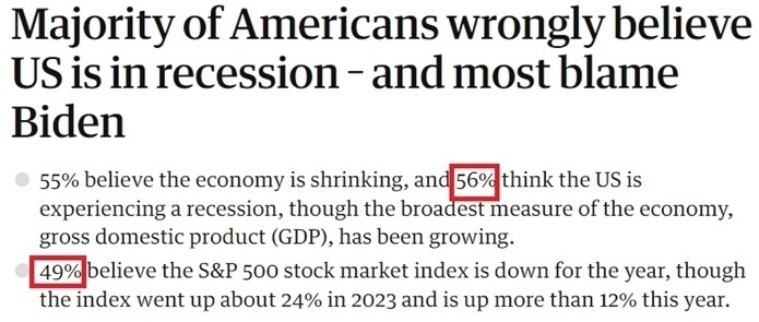 眼下美國(guó)的經(jīng)濟(jì)現(xiàn)狀,被經(jīng)濟(jì)學(xué)家們稱為“氛圍衰退”。這個(gè)詞最早由網(wǎng)紅經(jīng)濟(jì)評(píng)論員凱拉 斯坎倫創(chuàng)造,用以描述人們對(duì)經(jīng)濟(jì)狀況存在的悲觀情緒,即便是表現(xiàn)良好的經(jīng)濟(jì)統(tǒng)計(jì)數(shù)據(jù)也無(wú)法消除這種悲觀情緒。