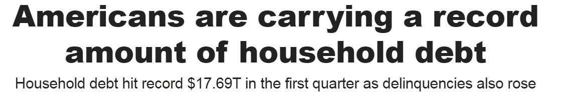 美國(guó)紐約聯(lián)邦儲(chǔ)備銀行公布的最新數(shù)據(jù)顯示,今年一季度,美國(guó)家庭債務(wù)總額達(dá)到17.69萬(wàn)億美元(約合人民幣128萬(wàn)億元),創(chuàng)下歷史新高。
