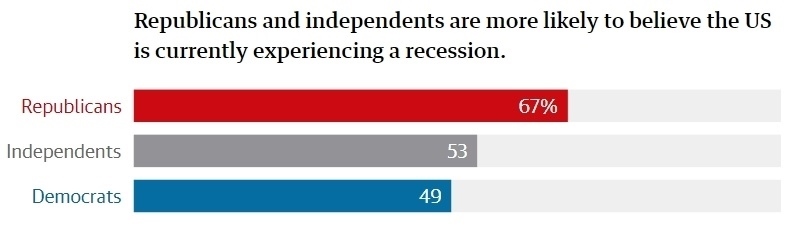 哈里斯民調(diào)公司進(jìn)行的民調(diào)顯示,67%的共和黨人認(rèn)為,美國(guó)經(jīng)濟(jì)正在萎縮,通貨膨脹正在加劇,整體經(jīng)濟(jì)正在惡化;而民主黨人中持相同觀點(diǎn)的人只有49%;此外,共和黨人比民主黨人更加相信,拜登政府的管理不善導(dǎo)致經(jīng)濟(jì)惡化。