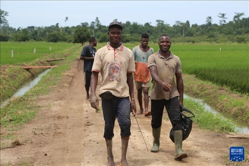 5月31日,在位于科特迪瓦南部迪沃省的格格杜墾區(qū),當?shù)胤N植戶在水稻田邊的道路上行走。新華社記者 張健 攝