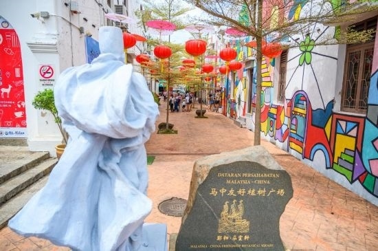 這是2019年12月20日在馬來(lái)西亞馬六甲拍攝的鄭和·朵云軒(馬六甲)藝術(shù)館外的馬中友好植樹(shù)廣場(chǎng)。600多年前,鄭和五次駐節(jié)馬六甲,由他帶到這片土地上的中華文化如今已深深融入當(dāng)?shù)囟嘣幕?。新華社記者朱煒攝