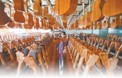 經(jīng)過10余年的發(fā)展,正安已經(jīng)擁有完整的吉他產(chǎn)業(yè)鏈?!澳壳拔覀冇屑圃旒捌渑涮灼髽I(yè)139家,任何一個(gè)吉他配件都可以在園區(qū)內(nèi)找到?!辟F州正安經(jīng)濟(jì)開發(fā)區(qū)管委會(huì)副主任代祥飛介紹,國際吉他產(chǎn)業(yè)園的吉他年產(chǎn)銷量達(dá)到220萬把,出口40多個(gè)國家和地區(qū),2023年出口額達(dá)11.13億元人民幣。